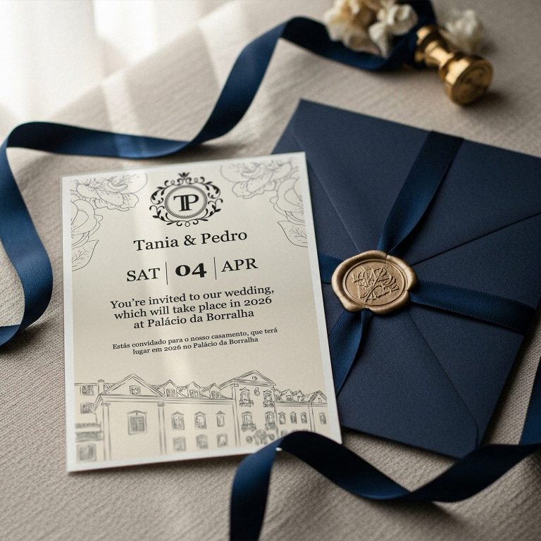 É com muito gosto que convidamos para o nosso Casamento, a realizar-se em 2026 no Palácio da Borralha, às 12h00.