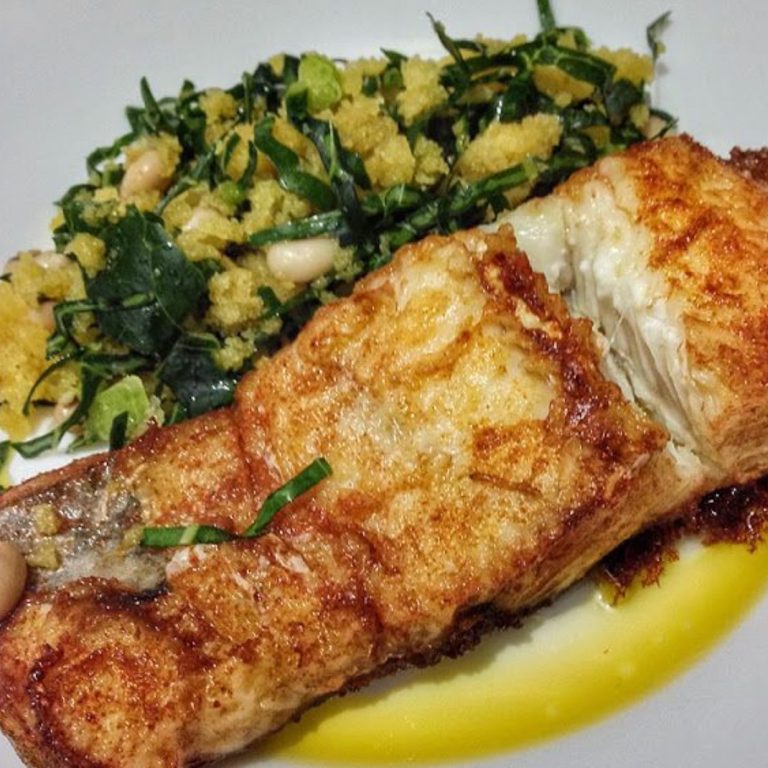 Confit Cod topped with a cornbread and farinheira crust, served with baby potatoes with sea salt and migas (broad beans, cornbread and greens)