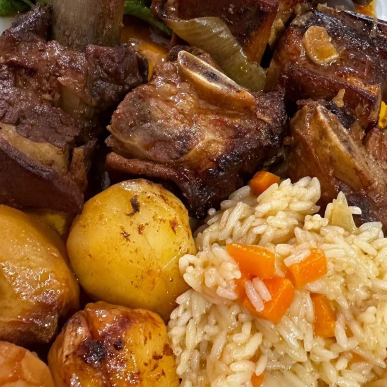 Vitela assada à moda de Lafões, acompanhada de uma pêra rocha caramelizada, esparregado de nabiças ou (espinafres), castanhas assadas e arroz árabe